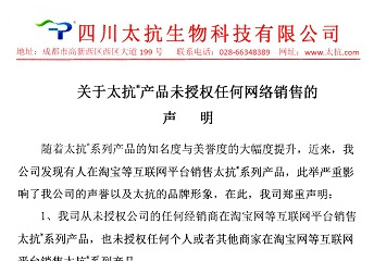 關(guān)于太抗?產(chǎn)品未授權(quán)任何網(wǎng)絡(luò)銷售的聲明發(fā)布日期:2017.05.15點擊量:7004 -