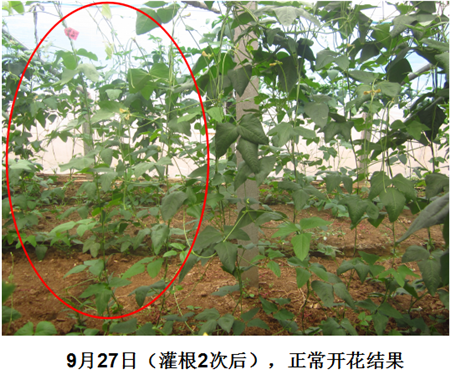 試驗結果:連續(xù)使用2次之后,發(fā)病的豆角開始正常的生長開花結莢