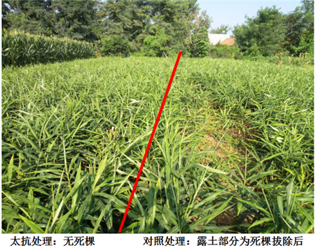 試驗結果:整個生育期使用3遍“枯木逢春”組合之后,大姜的死棵得到很好的控制,防效達到90%以上;
