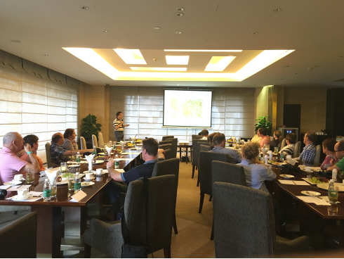 會上,董事長黃永博士詳細講解了太抗系列產(chǎn)品的作用機理及各地應用案列,得到了所有與會人員的高度關(guān)注。當講到太抗產(chǎn)品的安全性時,外賓們紛紛將在燒杯中的樣品看了又看,聞了又聞,可能實在覺得看似酸奶的生物農(nóng)藥著實稀奇。PPT放映結(jié)束后,外賓們接連提問,關(guān)于產(chǎn)品的保質(zhì)期、使用技術(shù)、投入產(chǎn)出比等等,董事長一一解答,連喝水的空都沒有。其中,來自來自維多利亞州的Gary Jeans講到其種植有4000公頃有機李用于出口中國,非常希望能用上太抗系列產(chǎn)品!此外,有外賓提出想帶些樣品回澳洲,也有外賓提出想和我公司澳洲研發(fā)人員深入交流,更有外賓要了黃董厚厚一疊名片說是要去澳洲幫我們做宣傳!
